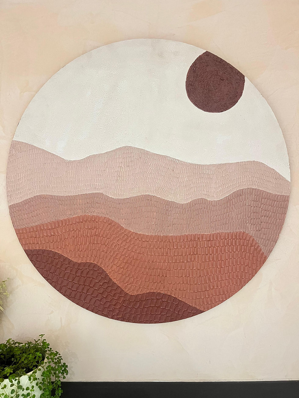 Lunar Peaks captures the serene dialogue between earth and sky through layered textures and subtle tonal transitions. The artwork portrays earthy mountain forms ascending toward a soft horizon, crowned by a bold, textured moon that commands the composition. Rendered in muted shades of brown and beige, the piece harmonizes beautifully with warm stucco backdrops, enhancing its immersive quality.